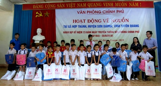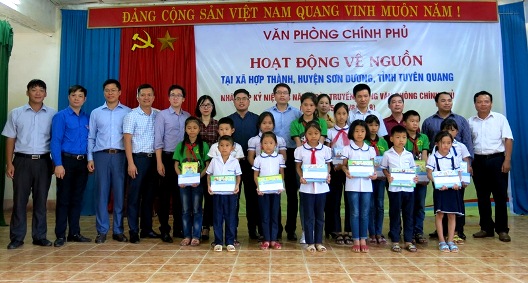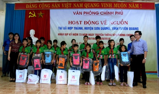 (Chinhphu.vn)-Ngày 11/8, Văn phòng Chính phủ (VPCP) đã phối hợp với Tập đoàn Viễn thông-Quân đội Viettel, Tập đoàn Công nghiệp Cao su Việt Nam, NXB Giáo dục Việt Nam, Công ty Cổ phần Helio Power, Công ty Klong tổ chức Chương trình “Về nguồn” tại xã Hợp Thành, huyện Sơn Dương, tỉnh Tuyên Quang.